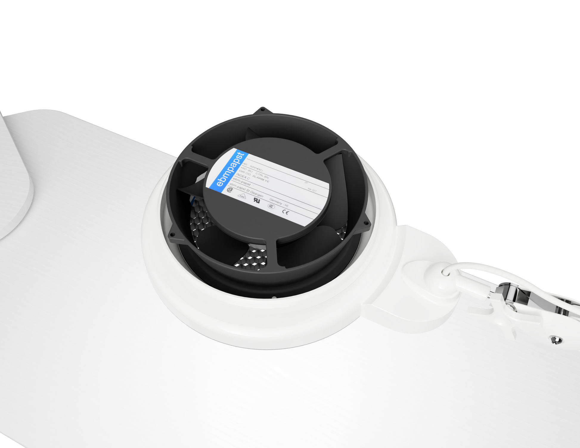 En modifisert aksialmotor med diagonale blader leder luftstrømmen slik at opptil 540 m³ støvbelastet luft per time renses effektivt. -